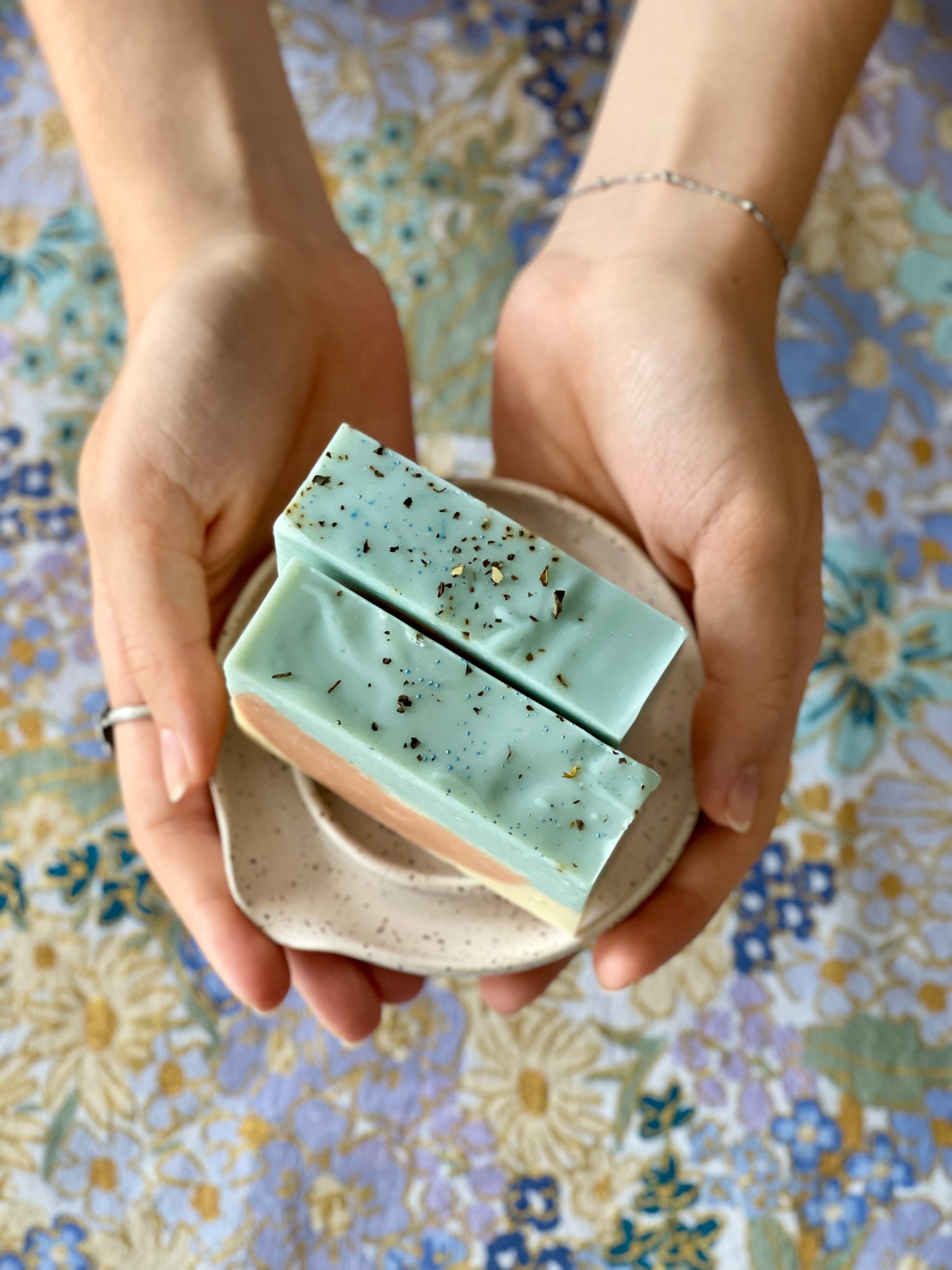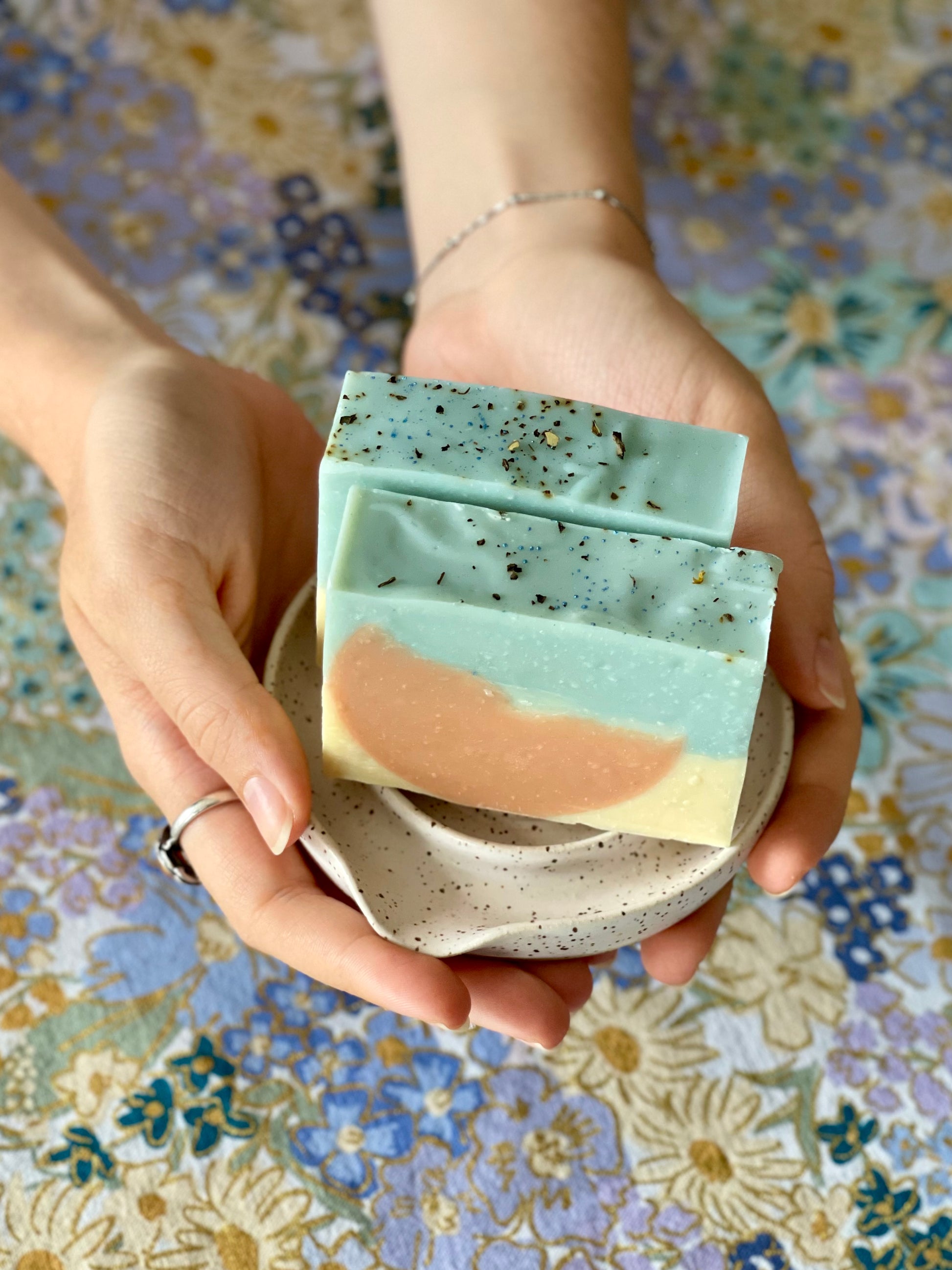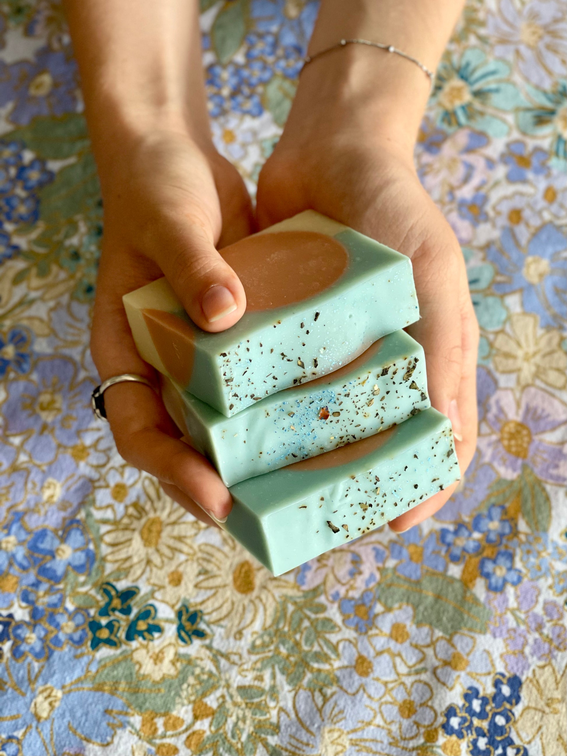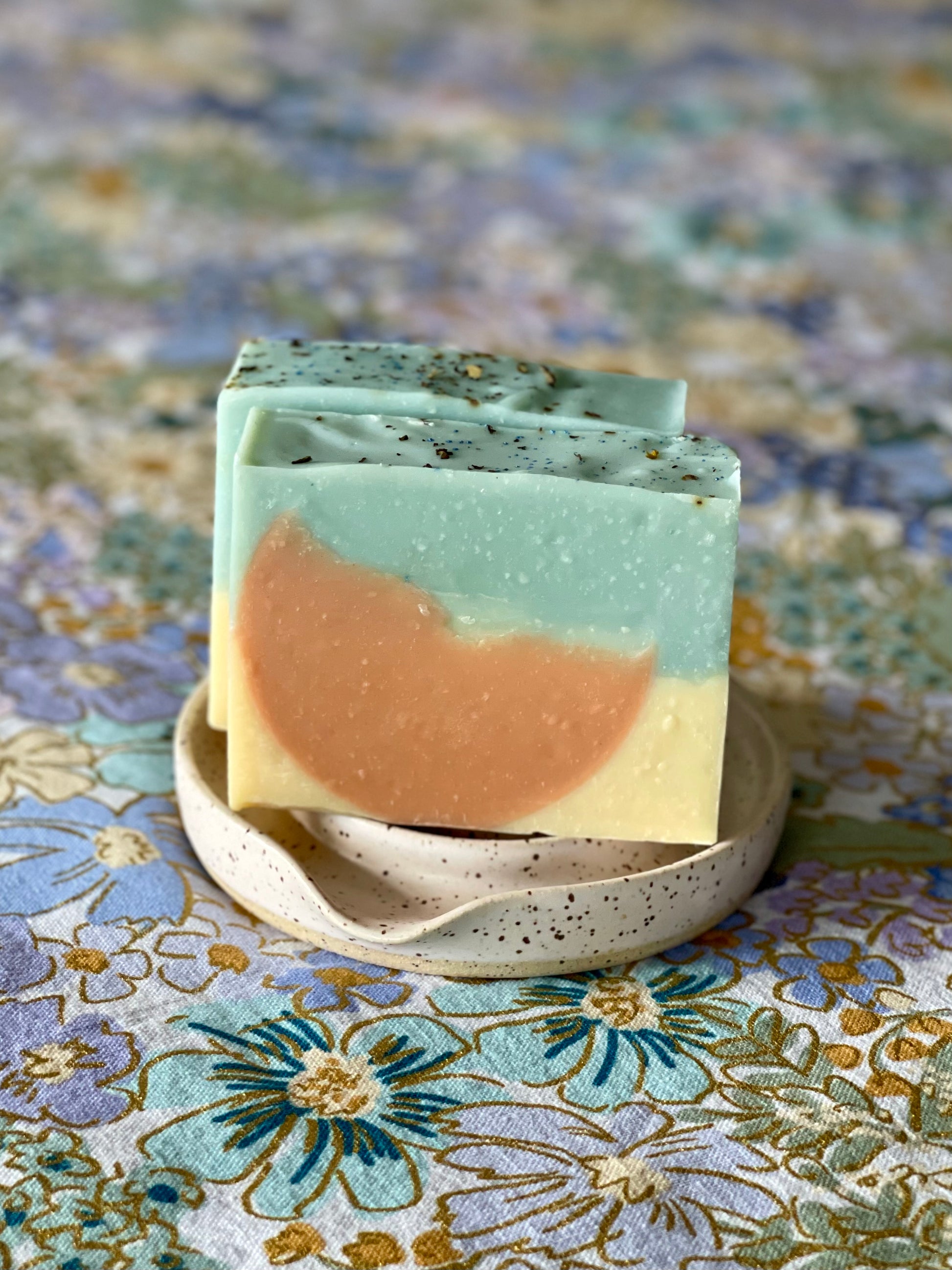 Employant l'ajout d'inclusions, ce savon est la somme de trois savons distincts pour recréer un tableau de lever du soleil.