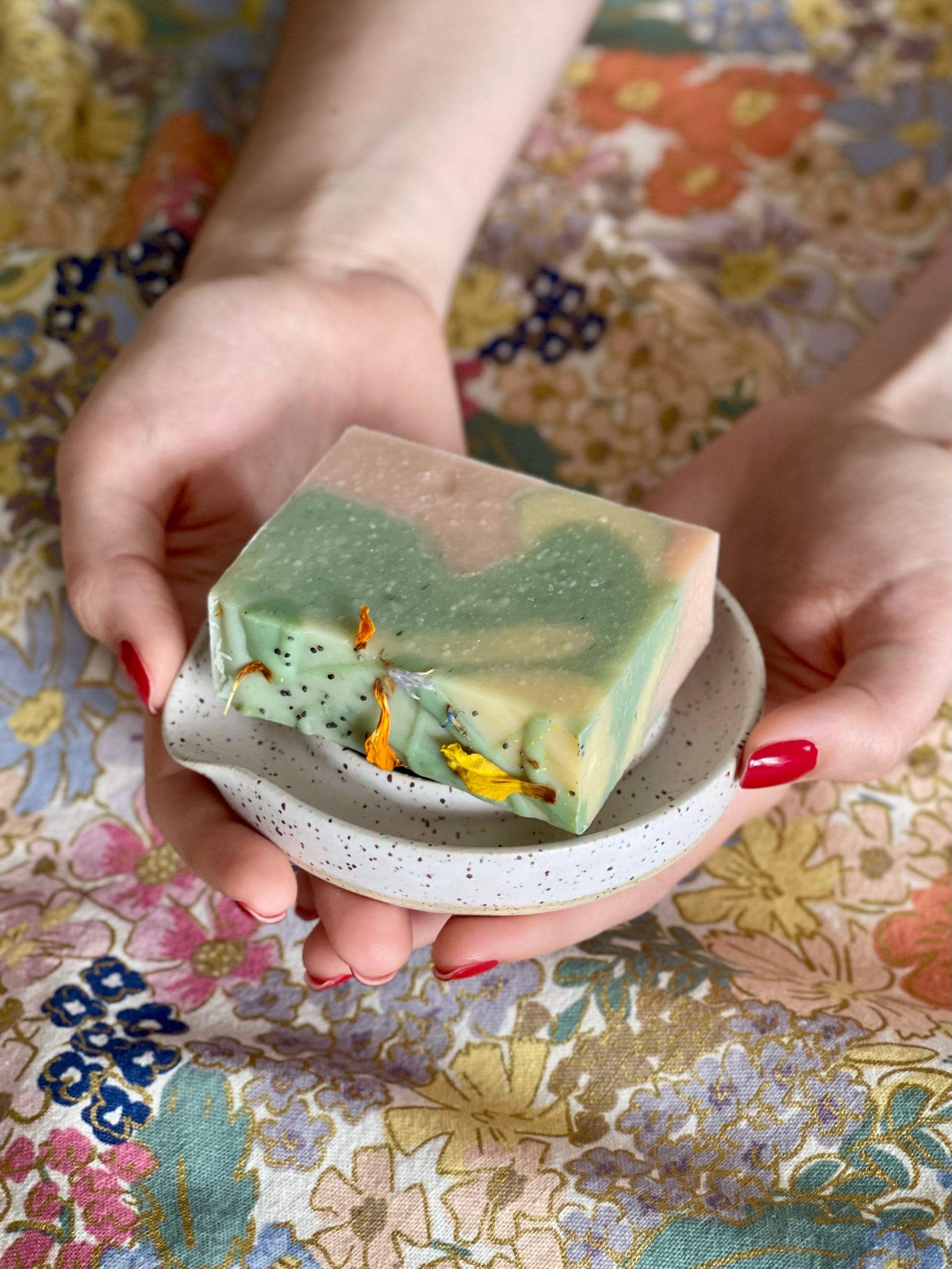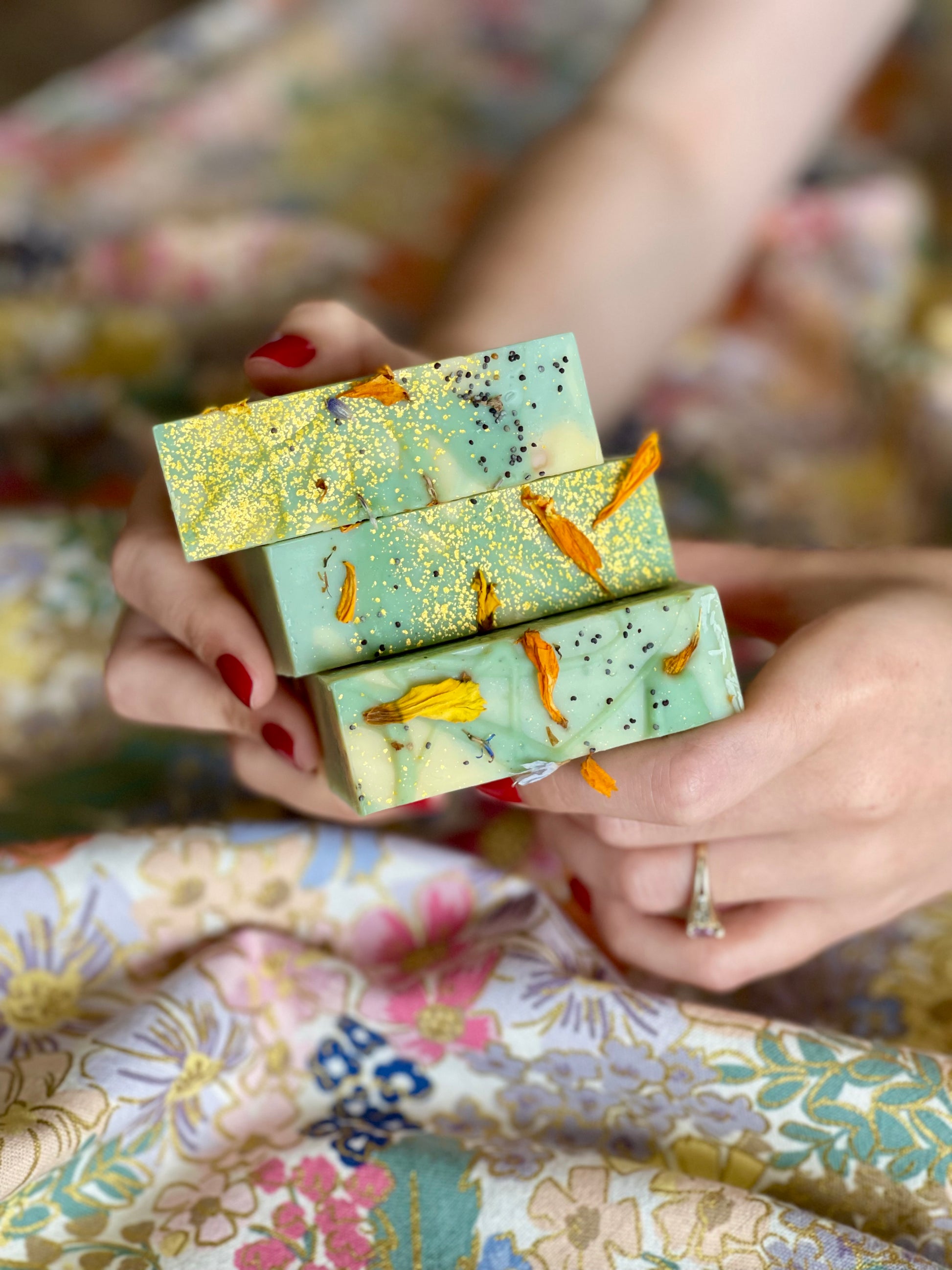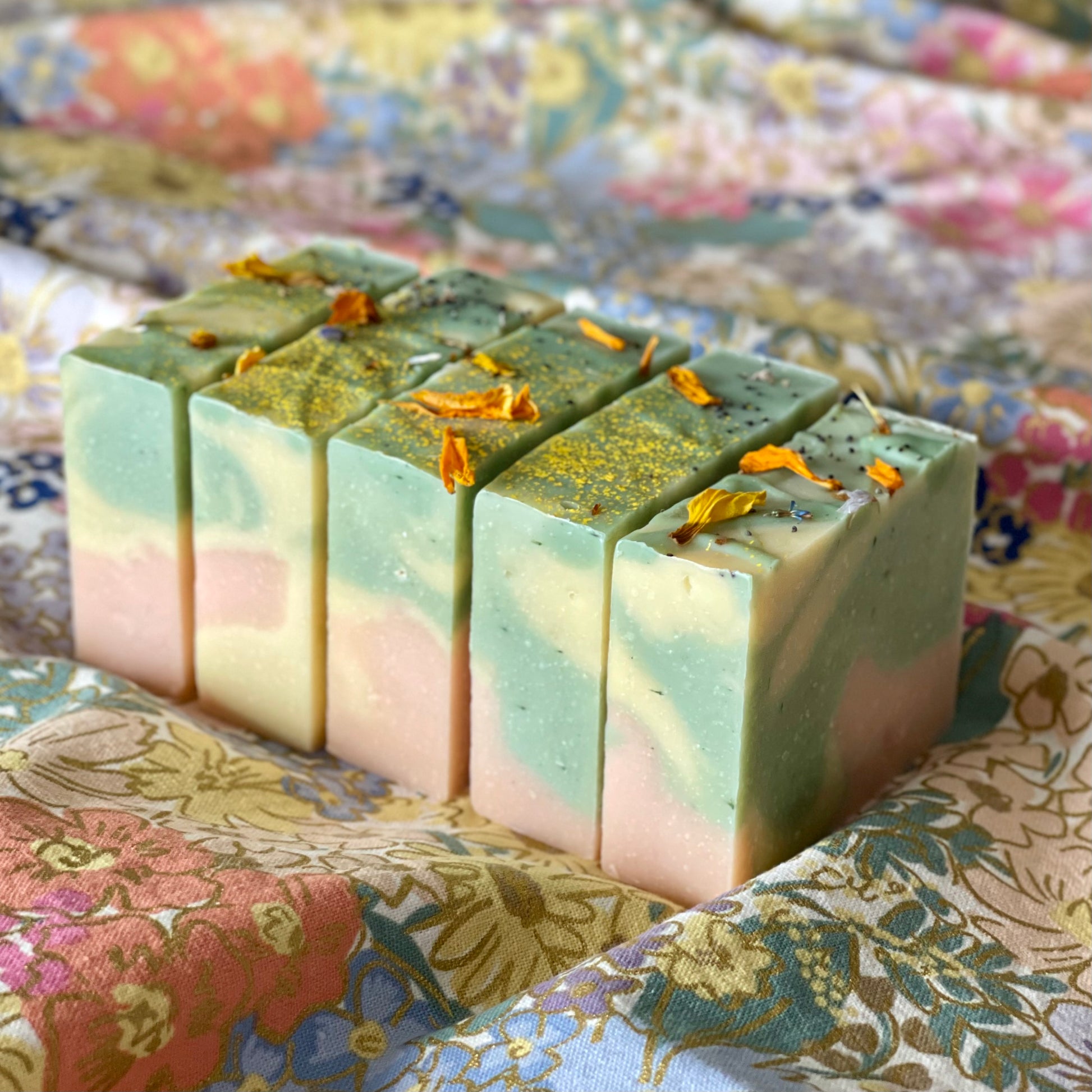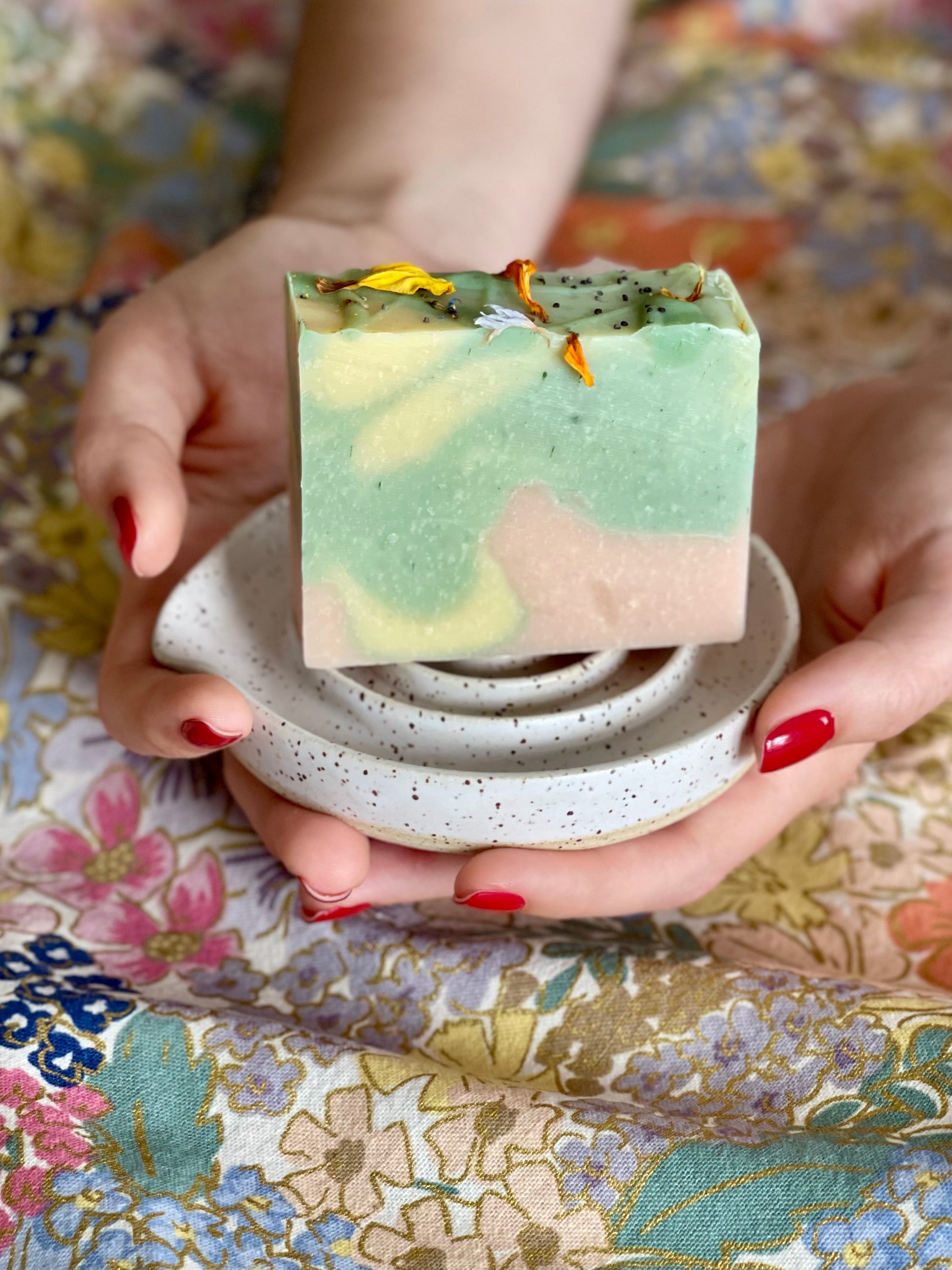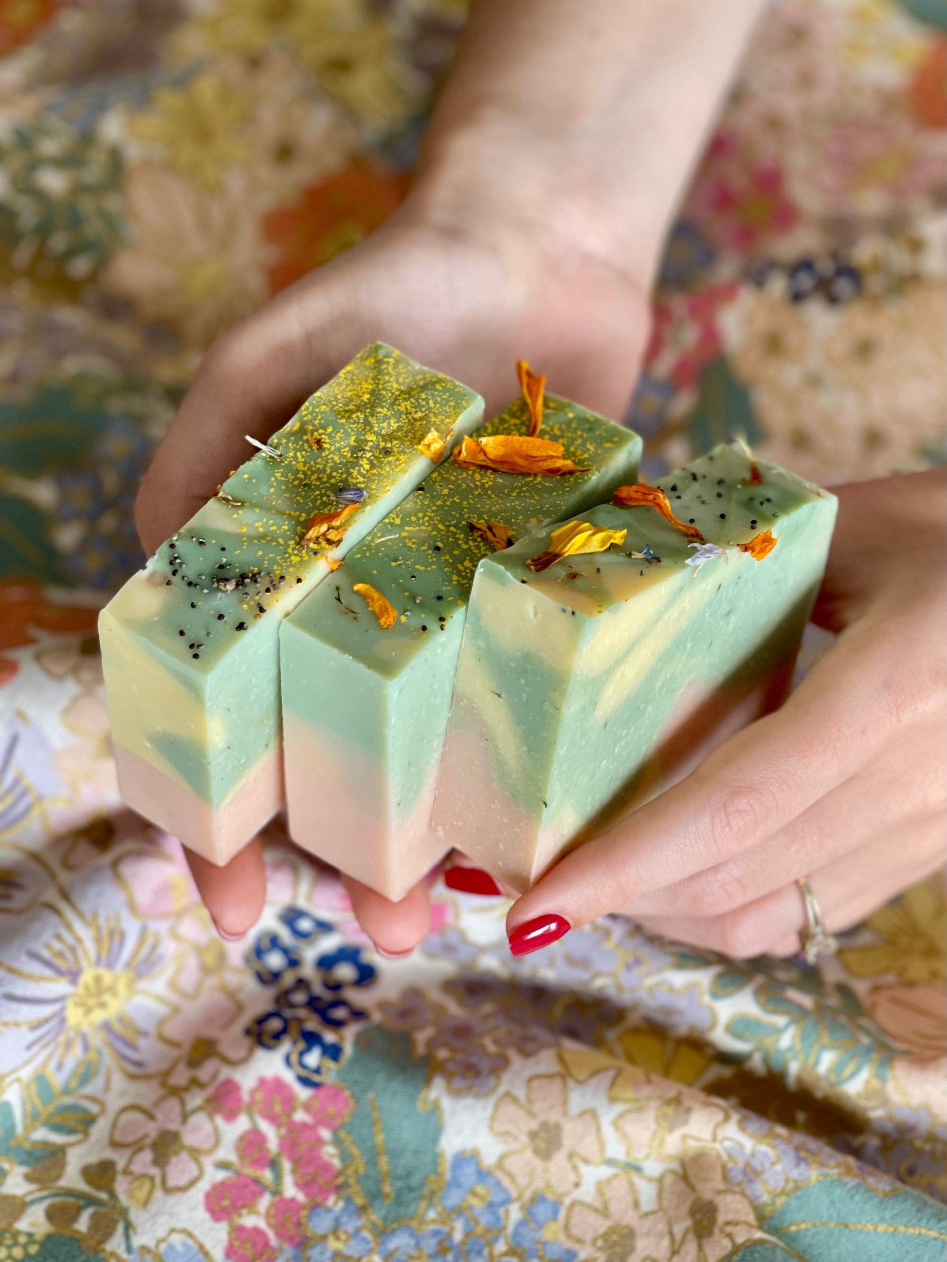 Chaque savon est unique de par le marbrage de trois pâtes aux parfums distincts qui se mélangent au gré du hasard.